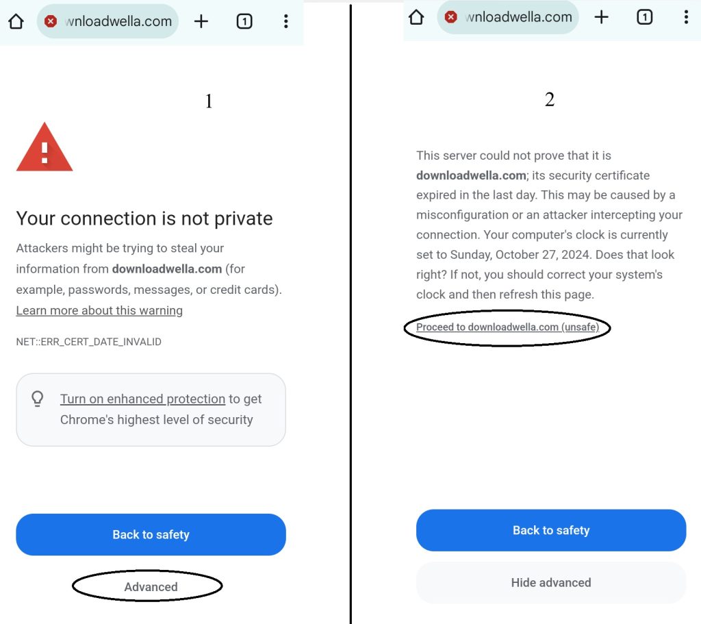 Downloadwella’s SSL certificate has expired. The cerificate is what makes your phone or internet browser view the website as trustworthy. The website is still functioning just would not be seen as trustworthy. As today isย Sunday we will not be able to fix the issue until Monday. If you would still like to download from downloadwella until the issue is fixed please follow these instructions: